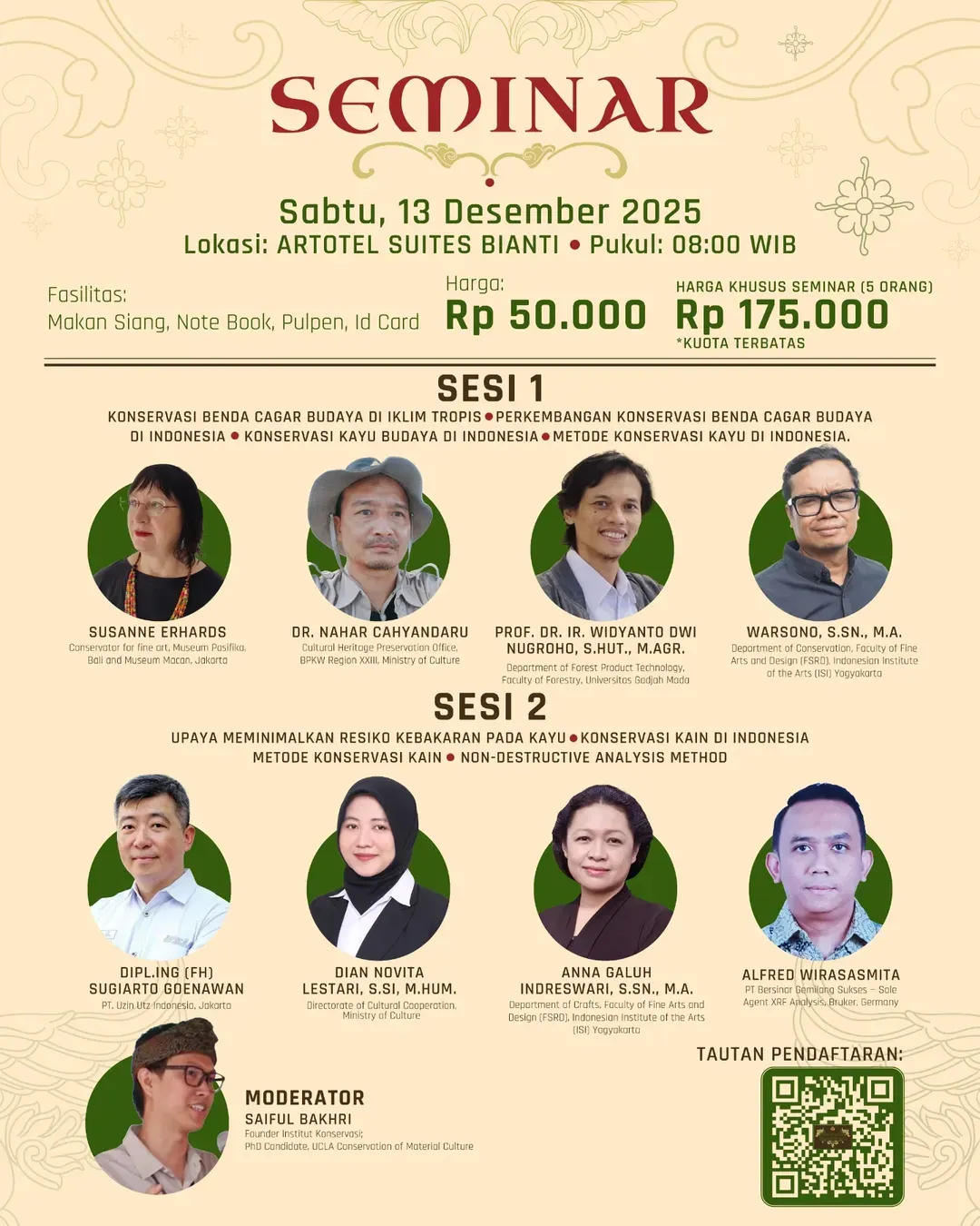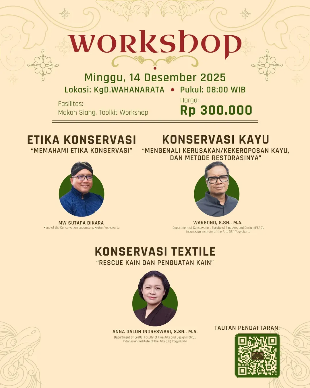 Workshop ini dirancang untuk kamu yang ingin memahami how-to dalam merawat dan menyelamatkan benda cagar budaya, mulai dari etika hingga teknik penanganan kayu dan tekstil.